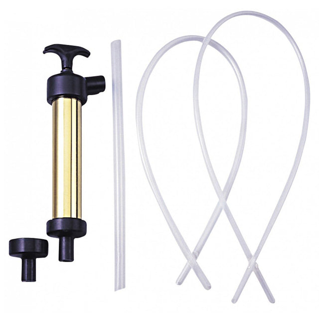 Hand sump pump manufactured from brass with rubber gaskets and hoses.